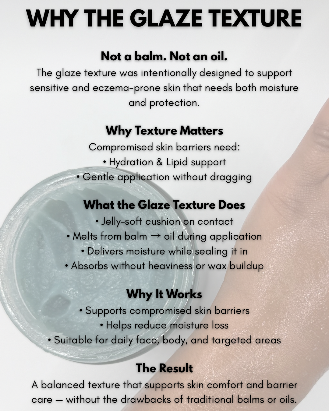 Our Skin Glazes are balm-to-oil treatments crafted to melt on contact and cushion skin in lightweight, breathable moisture. This unique glaze texture blends the comfort of a balm with the absorbency of an oil, helping seal in care without feeling heavy or greasy.