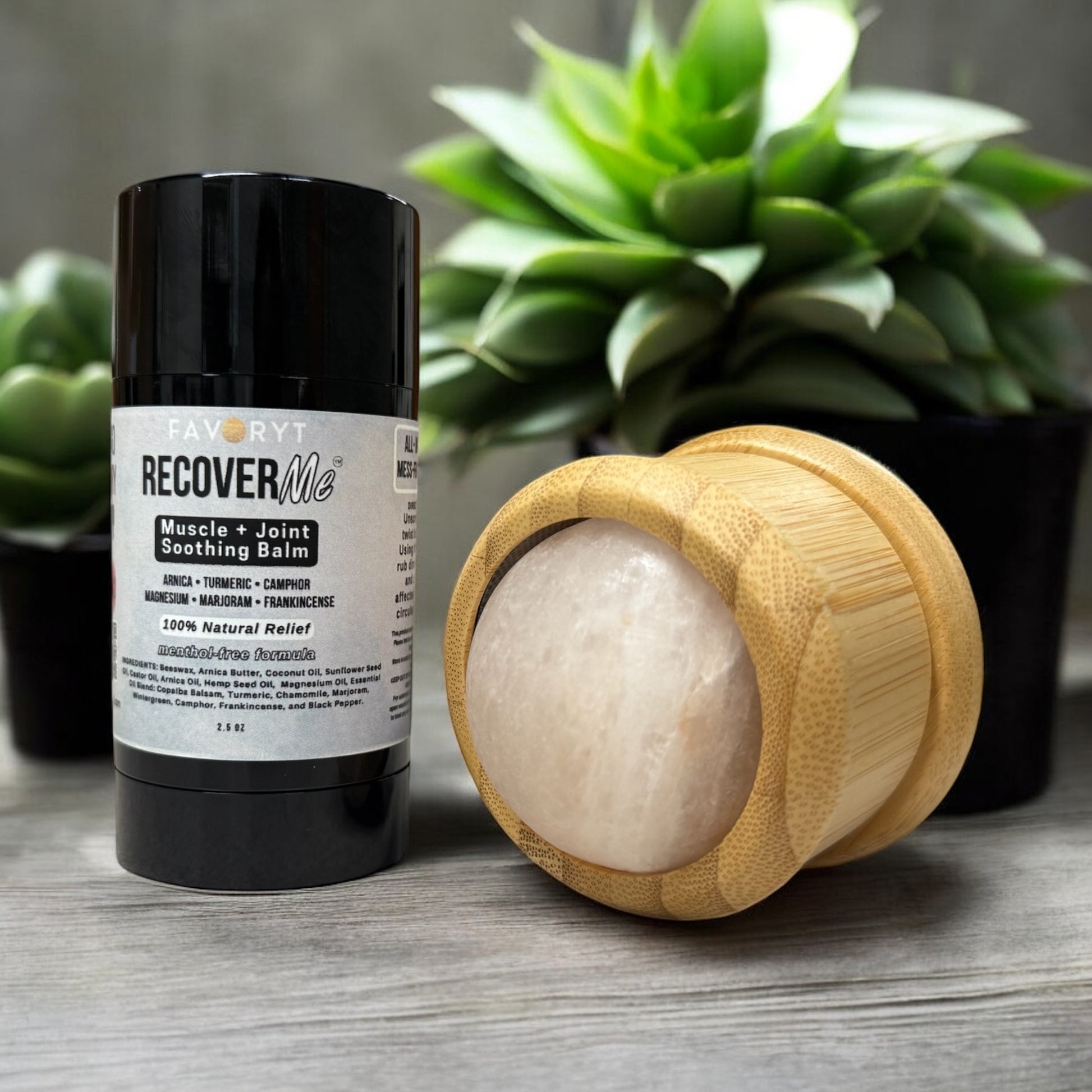 Upgrade your relaxation with our exclusive bundle featuring the Bamboo Himalayan Salt Massager plus our full-size 2.5 oz RecoverMe Pain Relief Balm — and save $5 when you buy them together.