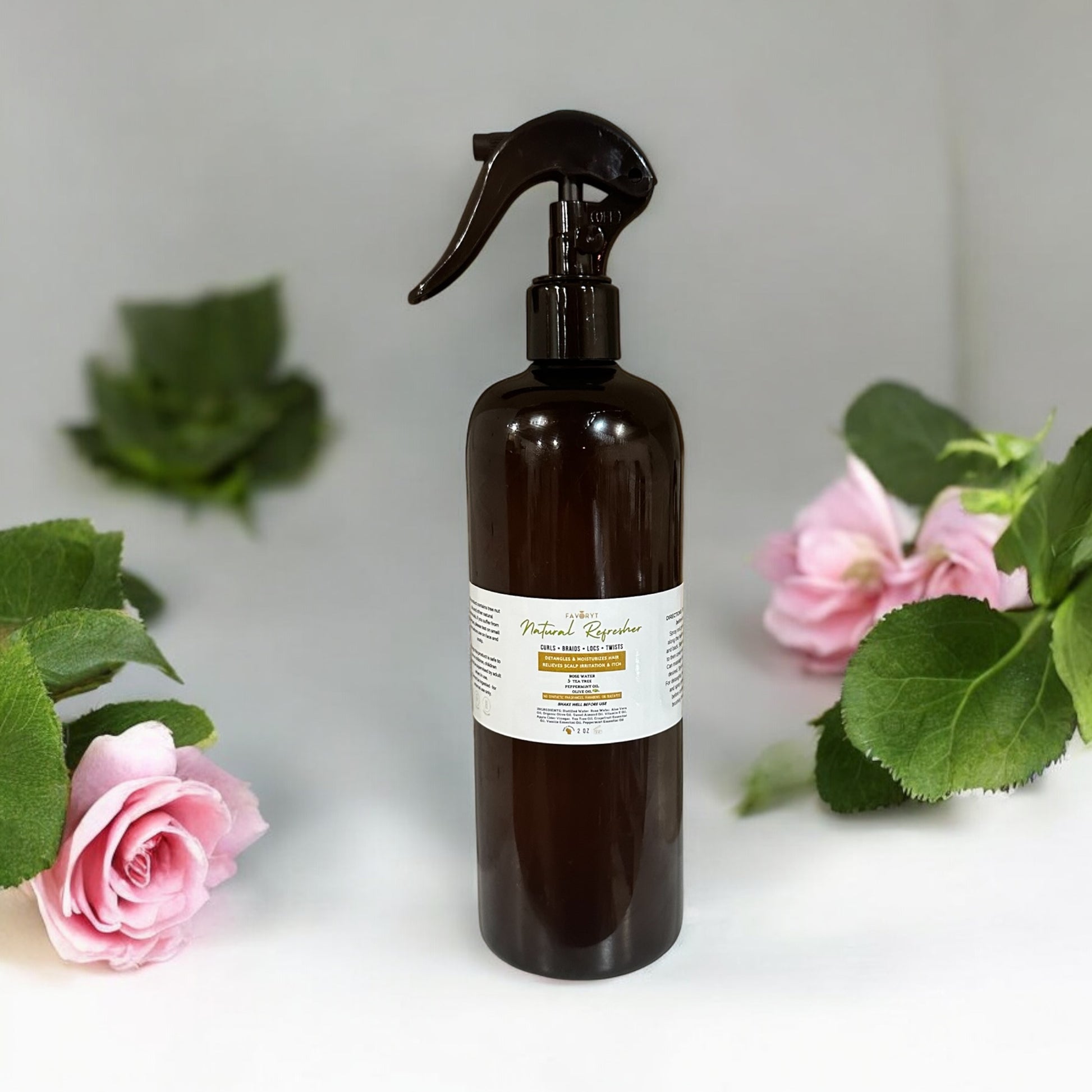INGREDIENTS: Distilled Water, Rose Water, Aloe Vera Oil, Organic Olive Oil, Sweet Almond Oil, Vitamin E Oil, Apple Cider Vinegar, Tea Tree Oil, Grapefruit Essential Oil, Vanilla Essential Oil, Peppermint Essential Oil